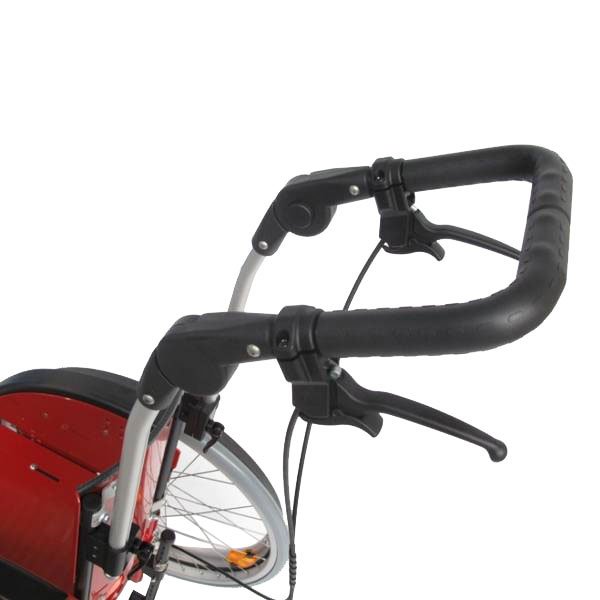 Die integrierte Benutzer-Seilzugbremse lässt sich ganz einfach von einer Begleitperson verriegeln. Die Verriegelung kann so in gebremstem oder ungebremstem Zustand aktiviert werden. Somit bleibt die Seilzugbremse, in nicht verriegeltem Zustand, durch den Anwender kinderleicht und intuitiv bedienbar, kann jedoch bei Bedarf jederzeit durch den Begleiter z.B. die Eltern verriegelt werden.