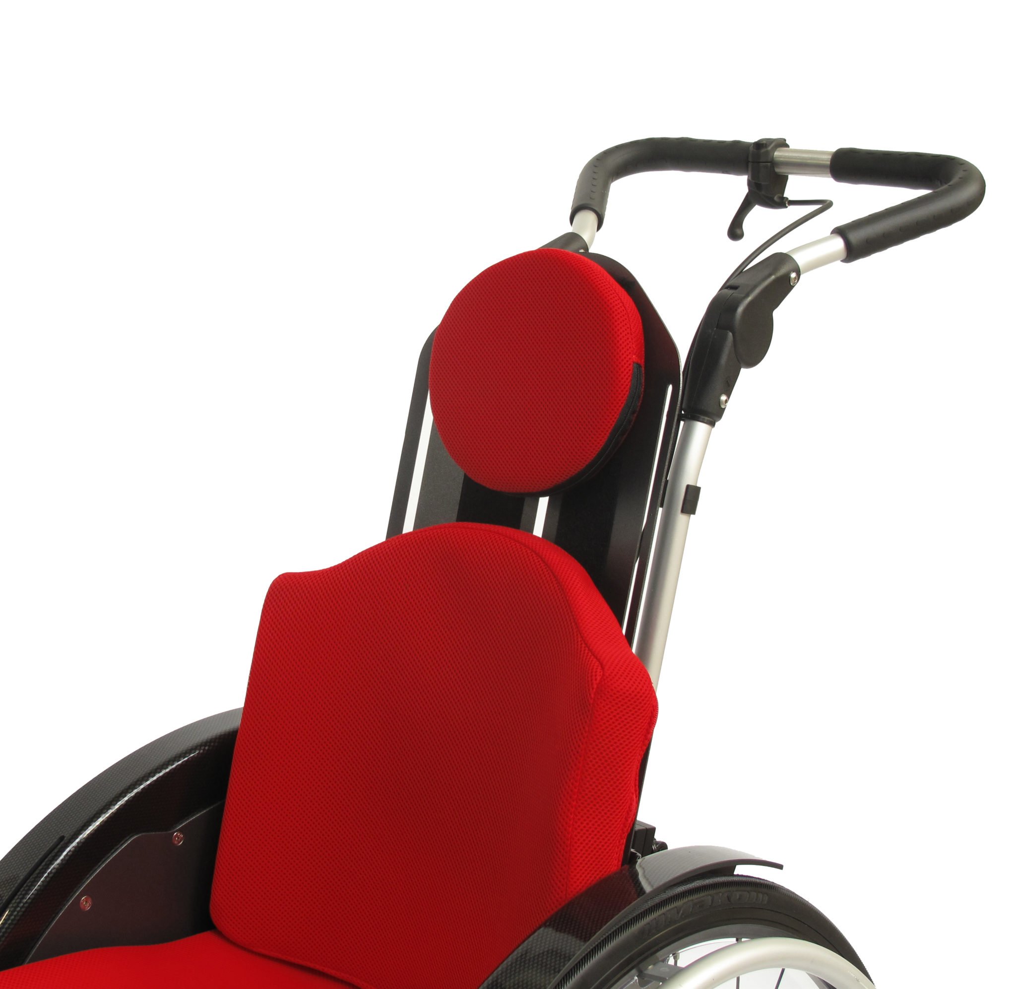 Für unsere Muldenrücken haben wir eine spezielle patentierte Rückenverlängerung mit Kopfstütze entwickelt, die den schnellen Wechsel zwischen Phasen der Aktivität und der Ruhe erlaubt. Soll der kleine Nutzer beim aktiven Fahren nicht durch eine Kopfstütze eingeschränkt werden, wird diese mitsamt der Rückenverlängerung einfach auf der Rückseite des Muldenrückens versenkt. Wechselt er allerdings in eine Phase der Entspannung, wird der Sitz gekantelt oder im Winkel geneigt findet der Kopf, durch die im Handumdrehen aktivierte Kopfstütze, ein bequemes Ruhepolster.