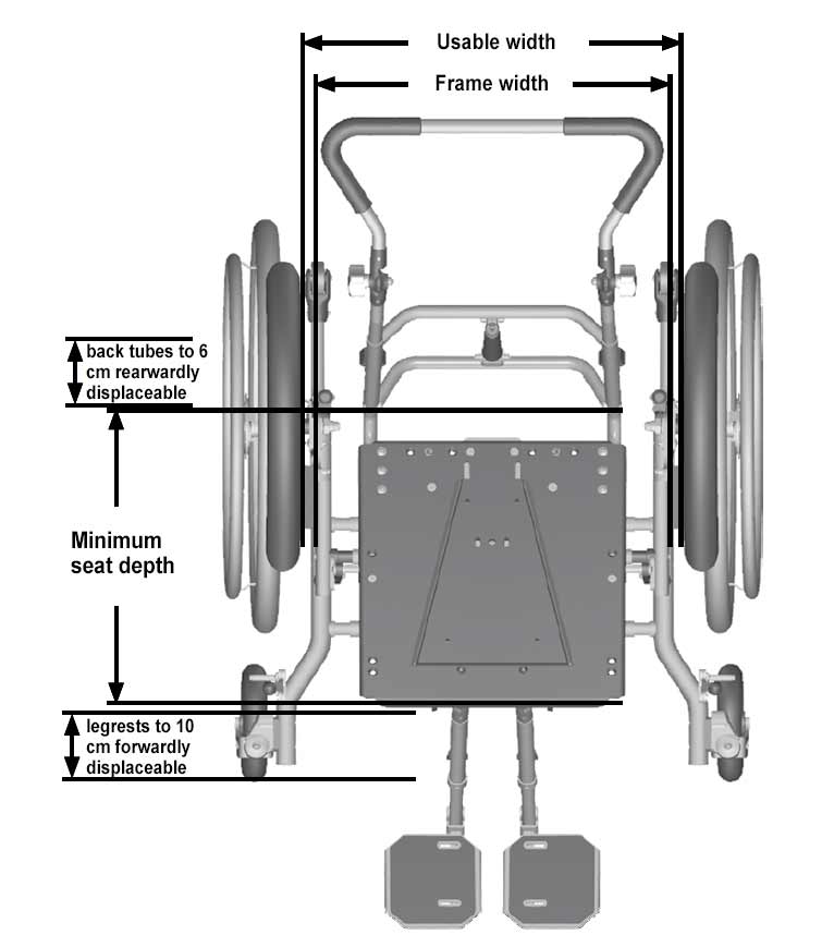 Please note that the back tubes can be moved backwards up to 6 cm and the legrests can be moved up to 10 cm to the front.