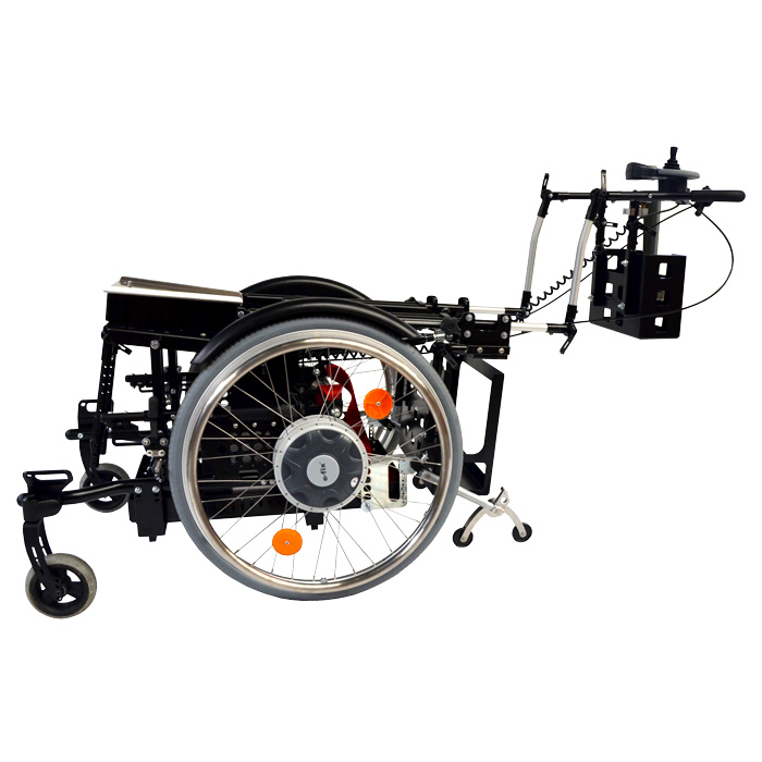 With the help of a special construction of the LoopSORG seat shell base frame, a solution has been created that meets all requirements. The user’s medical supply store also built a tailormade seat shell that fits perfectly on the seat shell base frame. The LoopSORG now offers the possibility to lay the user down completely, the change the angle or, depending on necessity, even bring the user into an upright position. In addition, numerous holders were added to accommodate the medical equipment and the electric drive. The angle-adjustable seat shell base frame with matching seat shell now allows the user to leave the house and be looked after in a facility.
