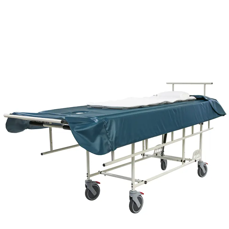 The shower trolley was made to the customer’s desired dimensions and requirements. For easier transfer and for cleaning and disinfecting, 3 sides can be opened. All 4 caster wheels move smoothly and can be locked.