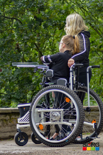 So that she can now participate in life at eye level, we have adapted our Boogie Drive stand-up driver especially for her. TheBoogie Drive is usually mostly used indoors and has larger drive wheels with which the user can move forward by him- or herself. So that our young patient can now also use her standing wheelchair outdoors, it has been fitted with appropriate tires. Both the caster wheels and the drive wheels are now suitable for both indoor and outdoor use. Since it cannot drive itself, the drive wheels are smaller than with a normal standing driver and height-adjustable push handles have been attached for the accompanying person. Thanks to the push handles and the stable frame geometry of the Boogie Drive, the standing wheelchair can also be tilted very easily. This means that curbs and larger bumps are no problem either.