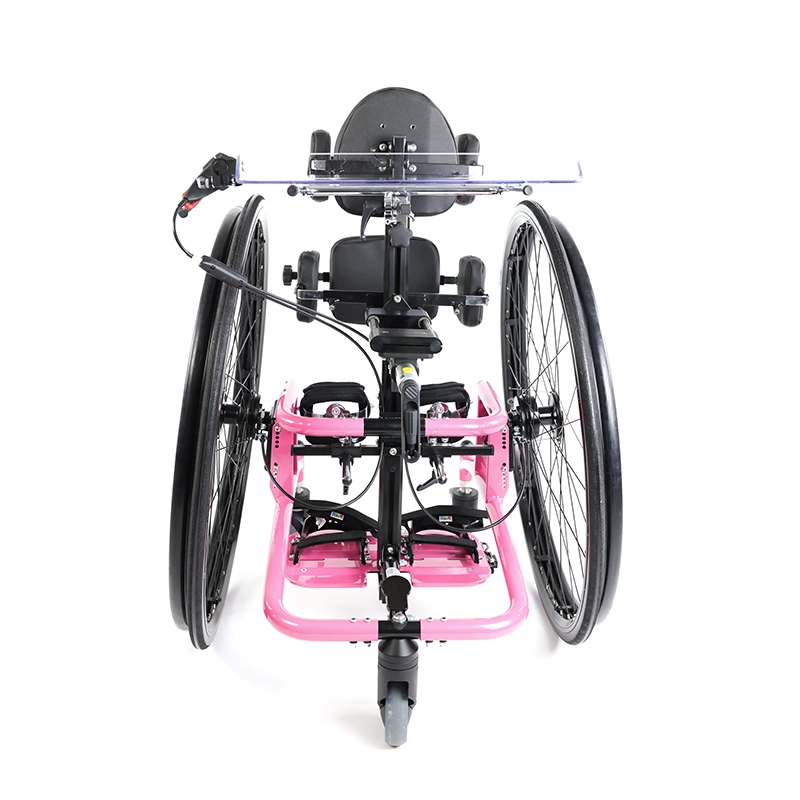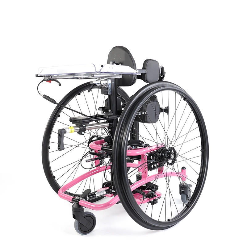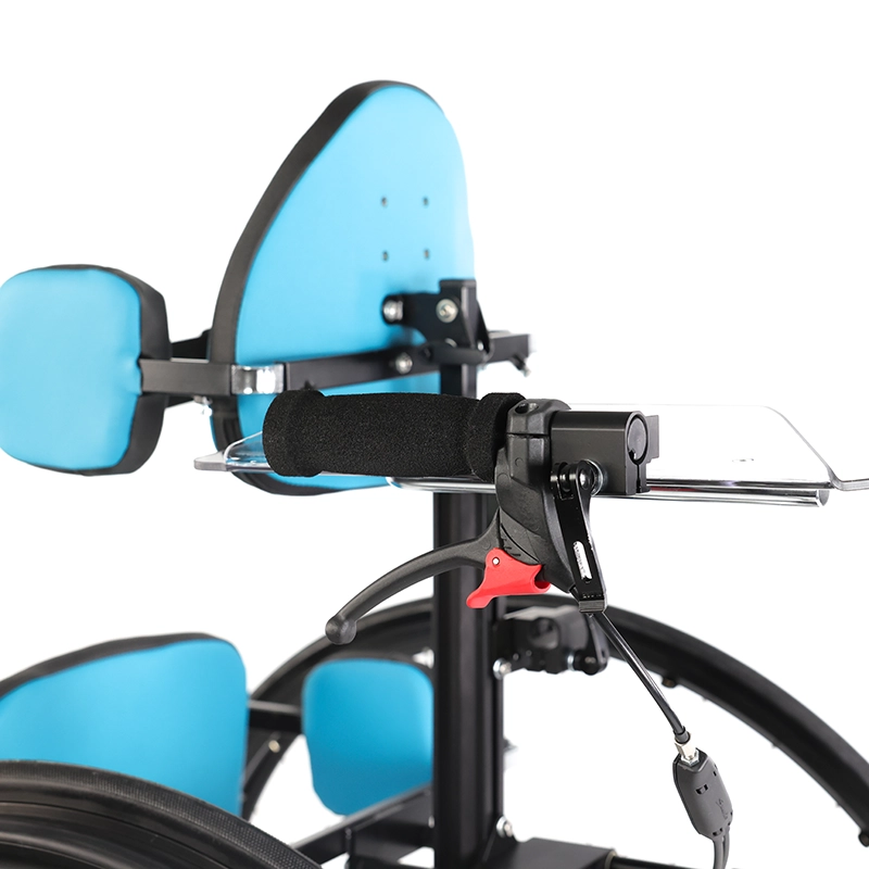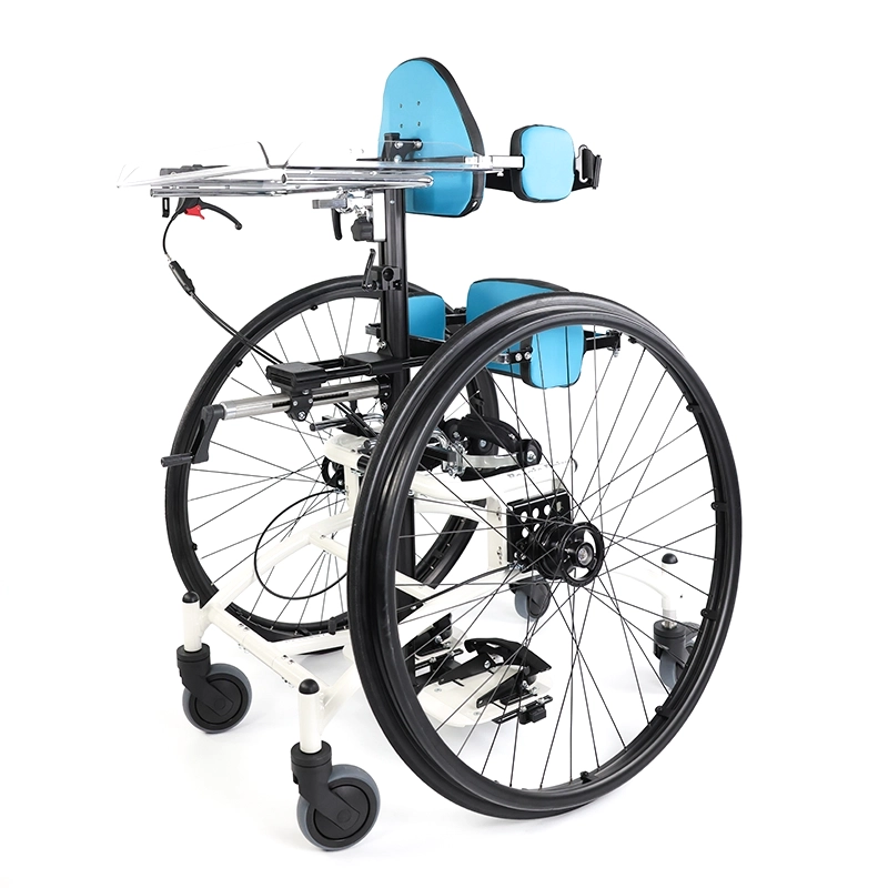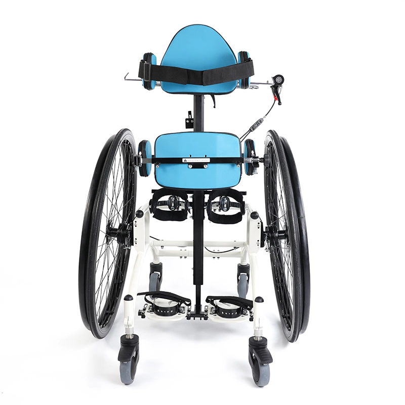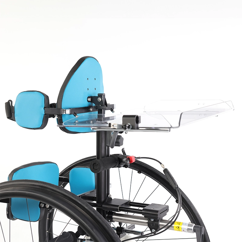 The danger of scoliosis, decubitus ulcers, trauma, spasms, cardiovascular, metabolism and/or digestive insufficiency etc. is distinctly reduced by this. Boogie Drive supports the strengthening and stabilising of the metabolism, the cardiovascular system, the sense of balance, perception, reflex control, the digestive system and breathing. The use of less strength when driving due to the large wheels, the ergonomically ideal shoulder-driving wheel-position, its maneuverability in the smallest space, its child and development suitable, growable dimensions allow the therapeutically sensible use starting in the earliest child years. With the growable frame sizes the upright-therapy can continue into adulthood.