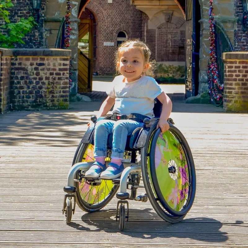 Ein lächelndes Mädchen im KinderrollstuhlOut of the buggy – into independent mobility. We are born with the desire to be mobile. In order to avoid possible consequential damage, independent locomotion must be encouraged as early as possible (from the age of 12 months), even if the child’s physical abilities are limited. The Mio is an active children’s wheelchair, that offers children the opportunity to move around independently and explore the world. Independent mobility therefore supports the development of physical, cognitive and psychological skills.