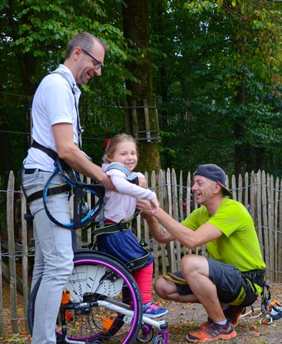 Mario hängt Hannas Gurte in die Seilrutsche ein, prüft alles nochmal nach und schaut dann zu Hanna. „Hanna, bist du bereit?“ fragt er. „Bereit.“ antwortet Hanna. Mario zählt von 5 rückwärts und mit ein bisschen Schwung von ihrem Guide saust sie los. Unterwegs hört man sie laut lachen und wenig später landet sie sicher und unglaublich stolz in den Armen ihres Papas, der sie auf der anderen Seite schon erwartet hat.