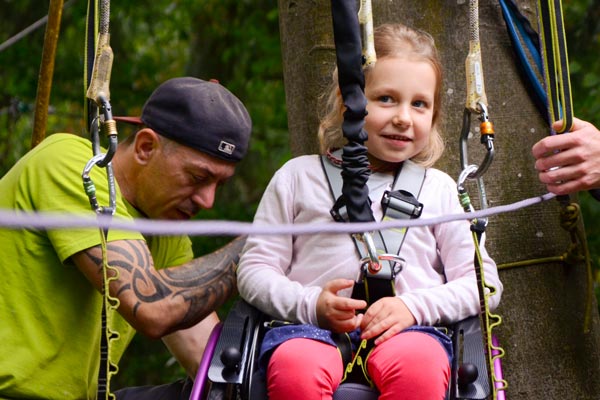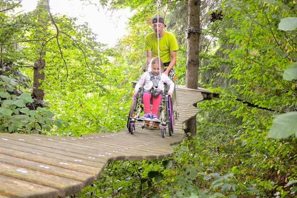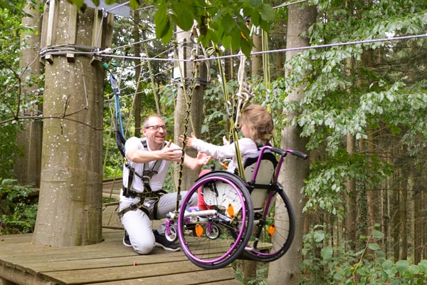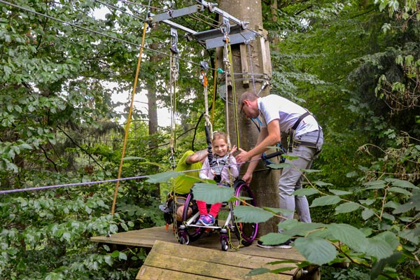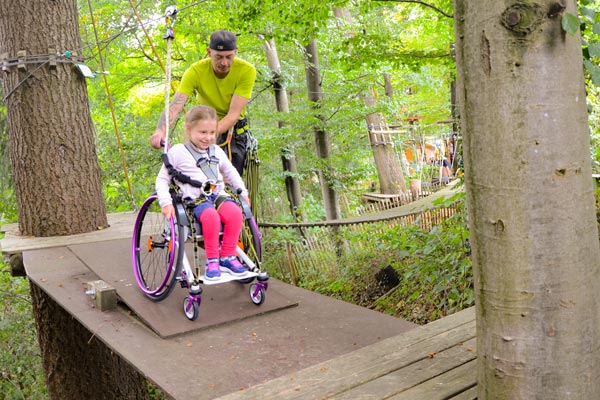Hanna (Name geändert) ist fünf Jahre alt und aufgrund eines Gendefekts auf einen Rollstuhl angewiesen. Sie besucht den örtlichen integrativen Kindergarten und ist eine fröhliche und aufgeweckte junge Dame. Außerdem probiert sie auch gerne neue Sachen aus und so war sie sofort hellauf begeistert, als ihr Papa ihr die Idee mit dem Kletterpark vorschlug. Jetzt fragt man sich natürlich… geht das denn? Mit dem Rollstuhl in den Kletterpark? Ja, das geht… zumindest im Skypark in Schwäbisch Gmünd. Denn dort gibt es einen eigens für Rollstuhlfahrer angelegten Parcours. (Nachtrag: Leider musste der Rollstuhlparcours mittlerweile abgebaut werden.)