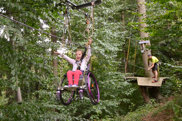 Der „Flying Fox“ ist eine lange Seilrutsche und Teil eines Parcours, der normalerweise nicht für Rollstuhlfahrer zugänglich ist, aber Mario macht heute eine Ausnahme. Als Hanna die Seilrutsche zum ersten Mal sieht, beginnen ihre Augen zu leuchten und sie kann es kaum erwarten.