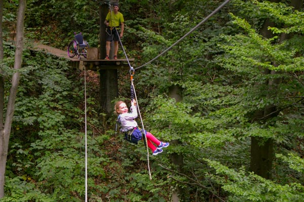 Hanna (Name geändert) ist fünf Jahre alt und aufgrund eines Gendefekts auf einen Rollstuhl angewiesen. Sie besucht den örtlichen integrativen Kindergarten und ist eine fröhliche und aufgeweckte junge Dame. Außerdem probiert sie auch gerne neue Sachen aus und so war sie sofort hellauf begeistert, als ihr Papa ihr die Idee mit dem Kletterpark vorschlug. Jetzt fragt man sich natürlich… geht das denn? Mit dem Rollstuhl in den Kletterpark? Ja, das geht… zumindest im Skypark in Schwäbisch Gmünd. Denn dort gibt es einen eigens für Rollstuhlfahrer angelegten Parcours. (Nachtrag: Leider musste der Rollstuhlparcours mittlerweile abgebaut werden.)