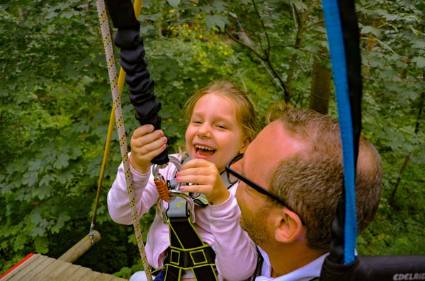 Mario hängt Hannas Gurte in die Seilrutsche ein, prüft alles nochmal nach und schaut dann zu Hanna. „Hanna, bist du bereit?“ fragt er. „Bereit.“ antwortet Hanna. Mario zählt von 5 rückwärts und mit ein bisschen Schwung von ihrem Guide saust sie los. Unterwegs hört man sie laut lachen und wenig später landet sie sicher und unglaublich stolz in den Armen ihres Papas, der sie auf der anderen Seite schon erwartet hat.