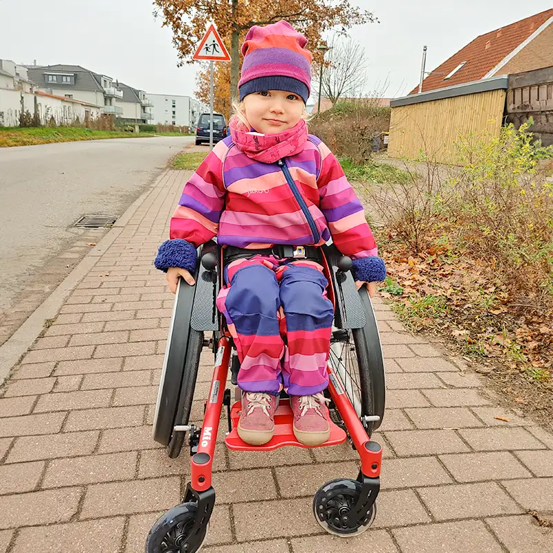 „Am liebsten ist Nele mit ihrem Mio unterwegs“, erzählt uns ihre Mutter, „denn mit ihrem Rollator kann sie nur kurze Strecken überwinden, und ist dabei auch nicht so schnell. Außerdem fällt ihr die Bewegung mit dem Rollator sehr schwer.“