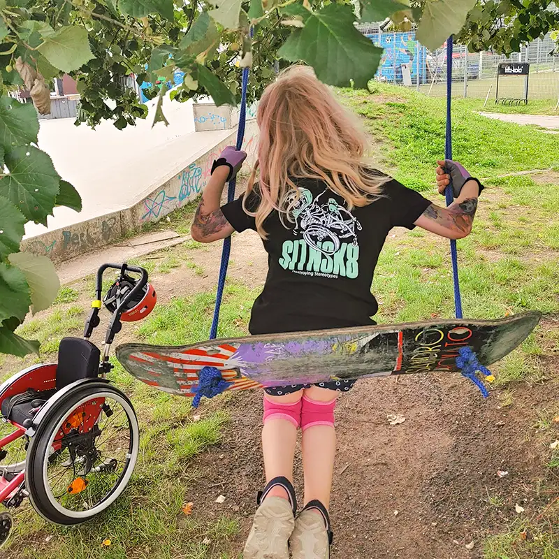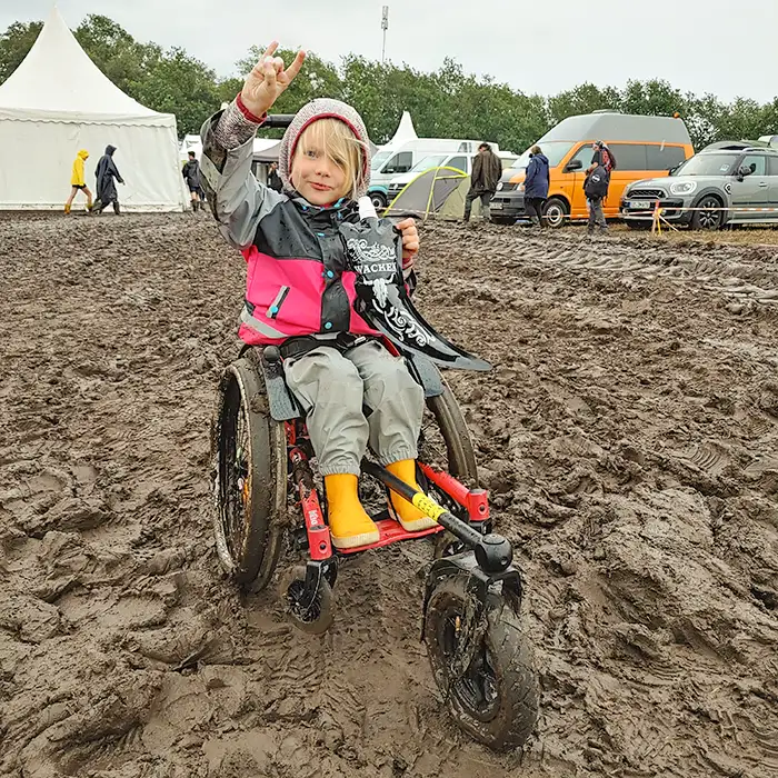 Was Nele mit ihrem Rolli so drauf hat, zeigt sie gerne beim Sit’n’Skate im Skatepark. Gekonnt saust sie in ihrem Mio so sicher über den Parkour, dass selbst die größeren Skaterkids in ihren Rollis ganz fasziniert von ihr sind. Übung macht bekanntlich den Meister und dies bestätigt Nele mit ihrem Können, denn mit zweieinhalb Jahren fing sie mit dem Rollstuhlfahren an. Das Handling lernte Nele damals sehr schnell. Schon nach einem halben Tag konnte sie lenken und bremsen. So gab ihr der Rolli die Möglichkeit, sich altersgemäß zu entwickeln und am Alltag teilzunehmen. „Wir können alles machen, was wir uns in den Kopf setzen. Vom Skiurlaub bis Strandurlaub ist alles dabei. Sogar die Wacken Schlammschlacht letztes Jahr war kein Problem“, erinnert sich Neles Mutter mit einem leichten Grinsen.