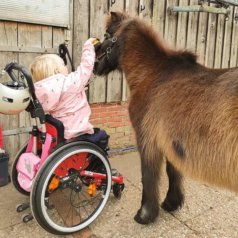 Um schnell wie ein Wirbelwind zu sein, zieht Nele das Krabbeln im Haus vor. Draußen benutzt sie dann ihren Kinderrollstuhl, wenn sie beispielsweise zu King fährt. King ist ein kleines Pony, das sie als Reitbeteiligung hat und um das sie sich regelmäßig kümmert.