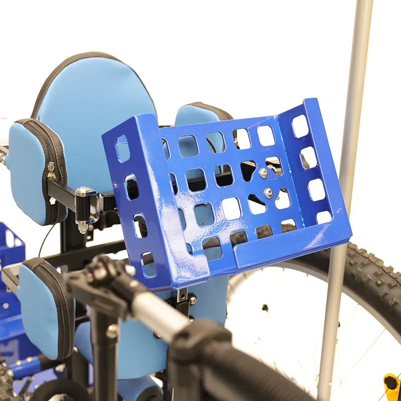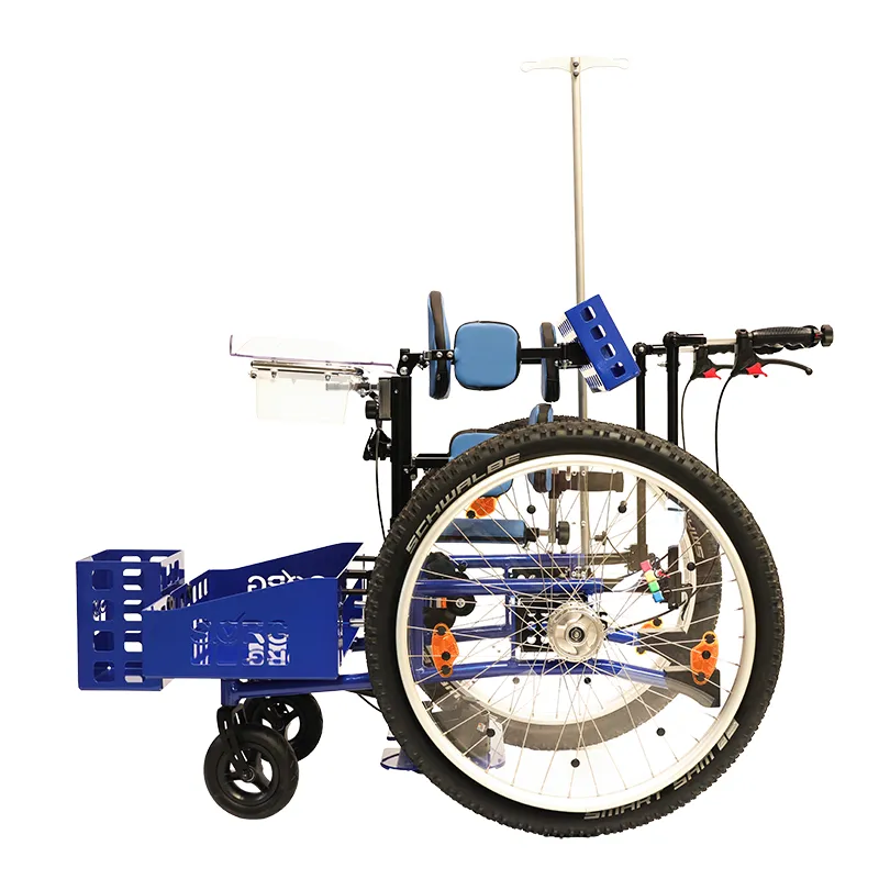 Auf Basis unseres Stehfahrers Boogie Drive wurde ein Outdoorstehfahrer entwickelt, mit dem Raphael auf Augenhöhe am Leben teilhaben kann. Alle medizinischen Geräte haben ihren Platz und es wurde auch eine Möglichkeit geschaffen, dass Raphael auch unterwegs seine Infusionen erhalten kann.